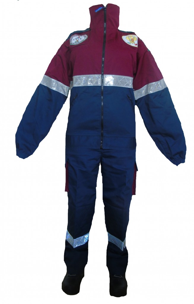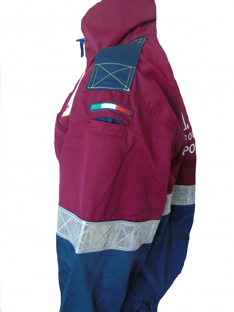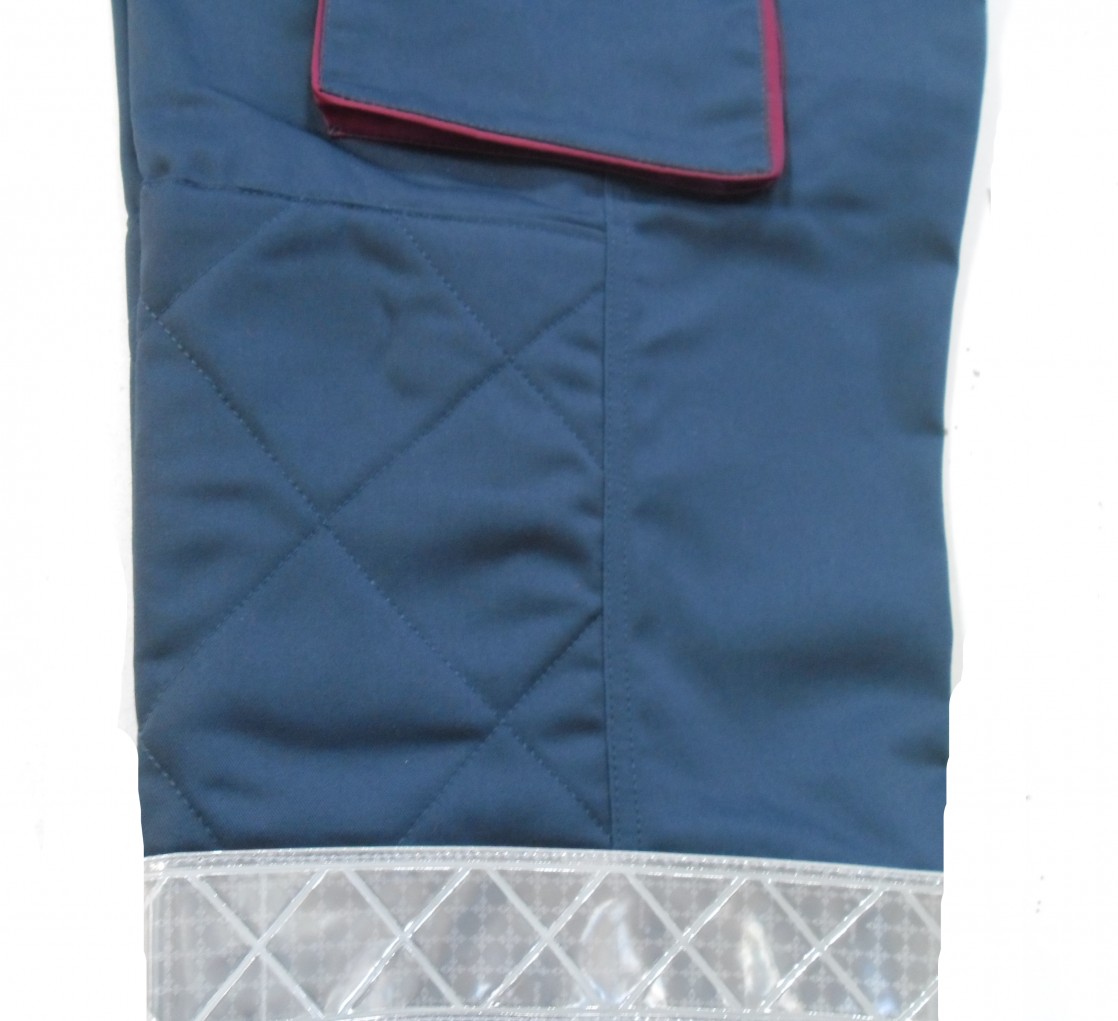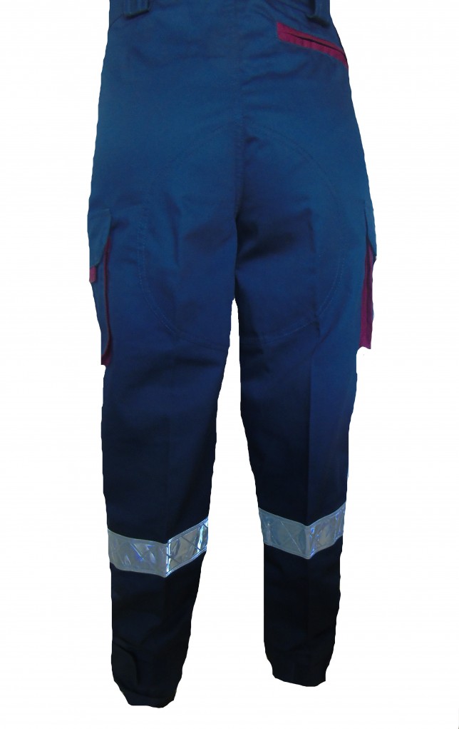 Trousers for rescuer, in navy and purple fabric, with 2 reflective tapes, multipocket : 2 front pockets closed by zip, 2 back closed by flap with velcro, 2 side pockets closed by flap with Velcro, reinforcement on the horse and padding on the knees, closed bottom with elastic and ankle zipper. CE EN 340 CLOTHING, BANDS CE EN 471