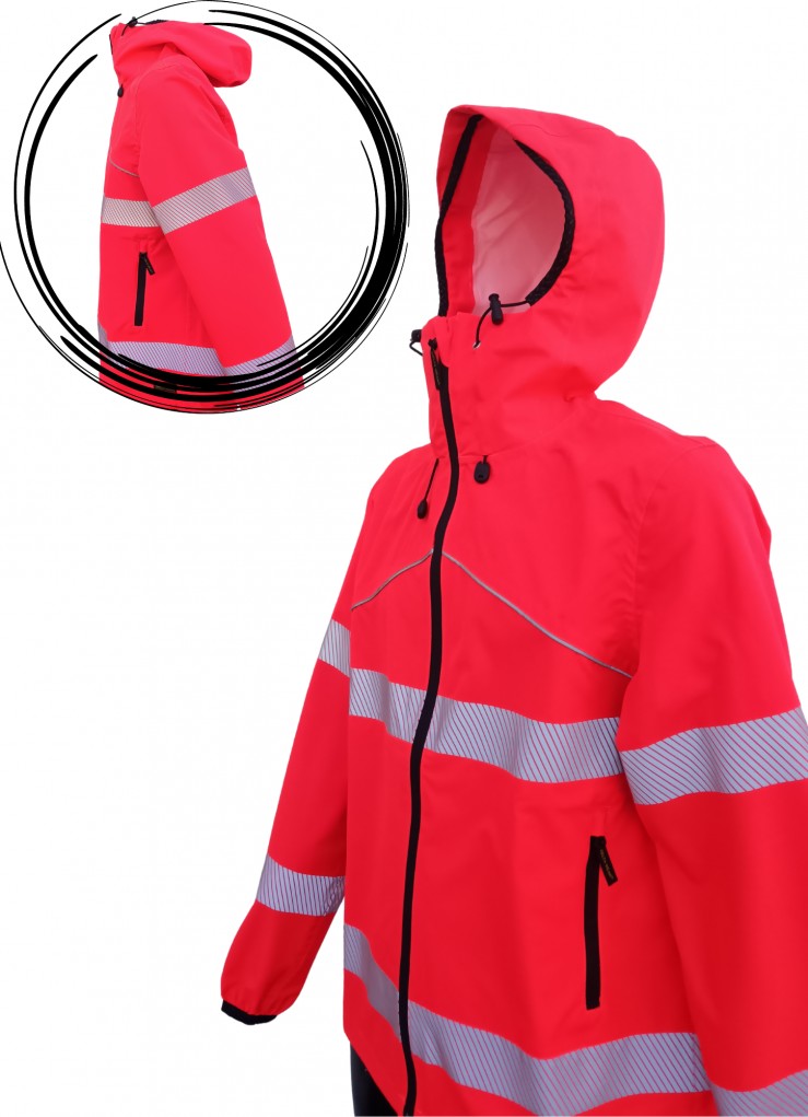 accessories: Waterproof jacket with hood that can be pulled out from inside the collar, ID holder on the chest, Waterproof double-slider zips at the centre of the front with throat protection, hand pockets with waterproof zips, Pocket on the right/left sleeve with waterproof zip and opening for radio antenna, Hood with visor and tight elastic band on the front (front). Adjustable cuffs with Velcro, Adjustable hem with drawstring. Reflective elements for greater visibility on the chest and wrists. IT IS POSSIBLE TO VARY THE POSITION OF THE ACCESSORIES, FOR EXAMPLE THE RADIO HOLDER ON THE CHEST OR ON THE ARM, ID HOLDER ON THE RIGHT OR LEFT CHEST.